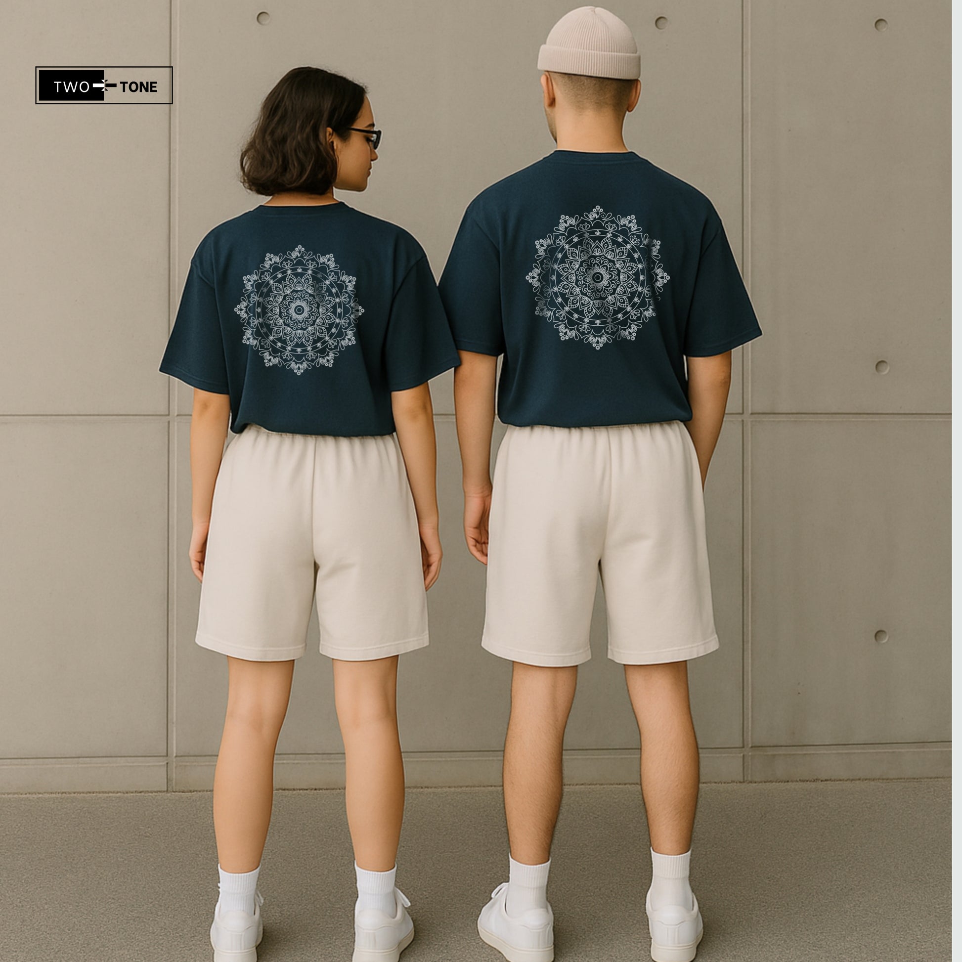 Unisex Navy Blue Oversized T-Shirt & Embroidered White Shorts Co-ord Set | Mandala Art Edition