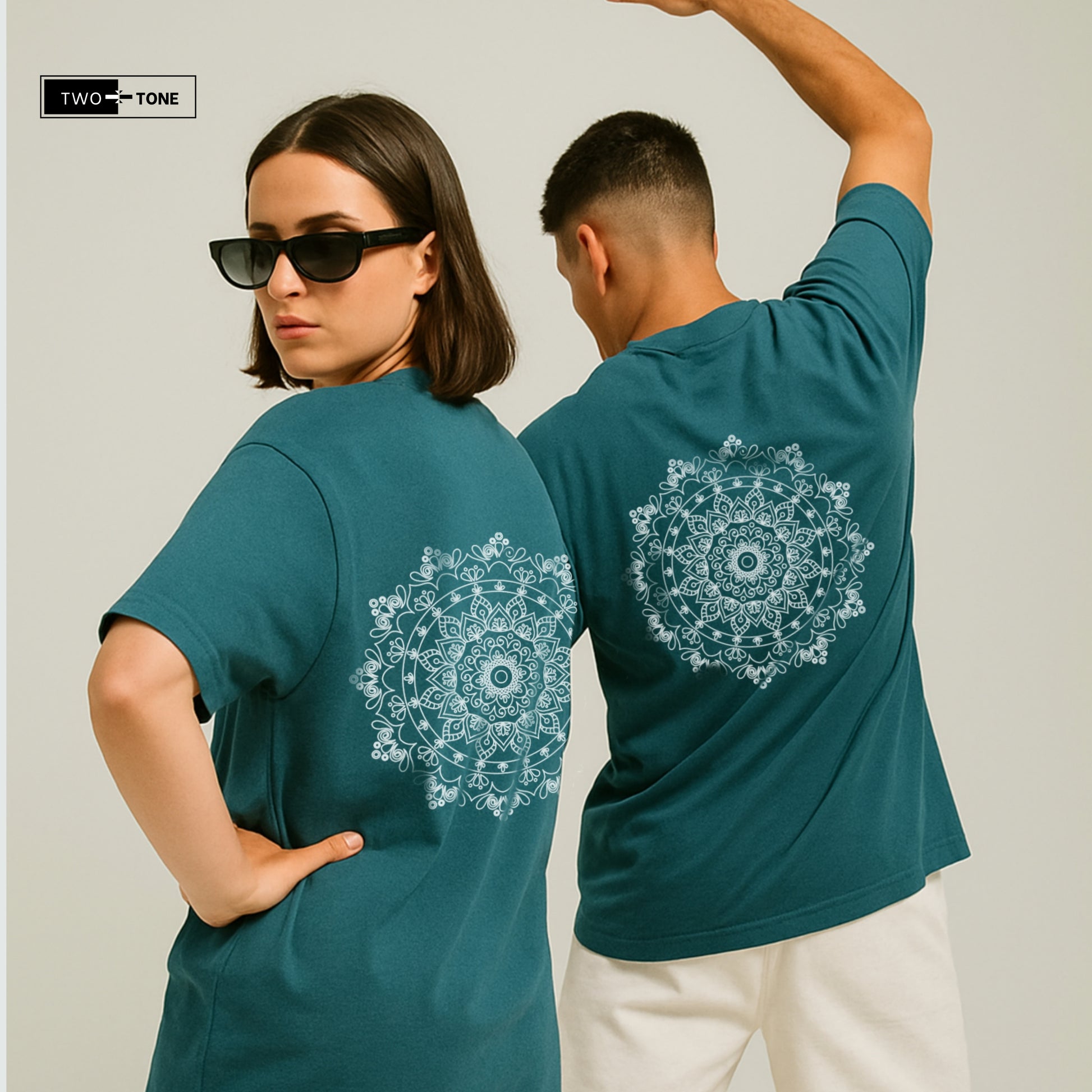 The oversized T-shirt, available in rich colors like Bottle Green, Maroon, Navy Blue, Red, and Petrol Blue, features a clean front and detailed Mandala artwork on the back — a symbol of balance, energy, and inner creativity. Made from soft, breathable cotton, the tee drapes effortlessly over all body types.